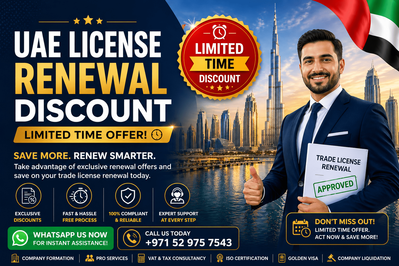 These are indicative figures. Actual costs vary based on Emirate, company structure, visas, and outstanding liabilities.